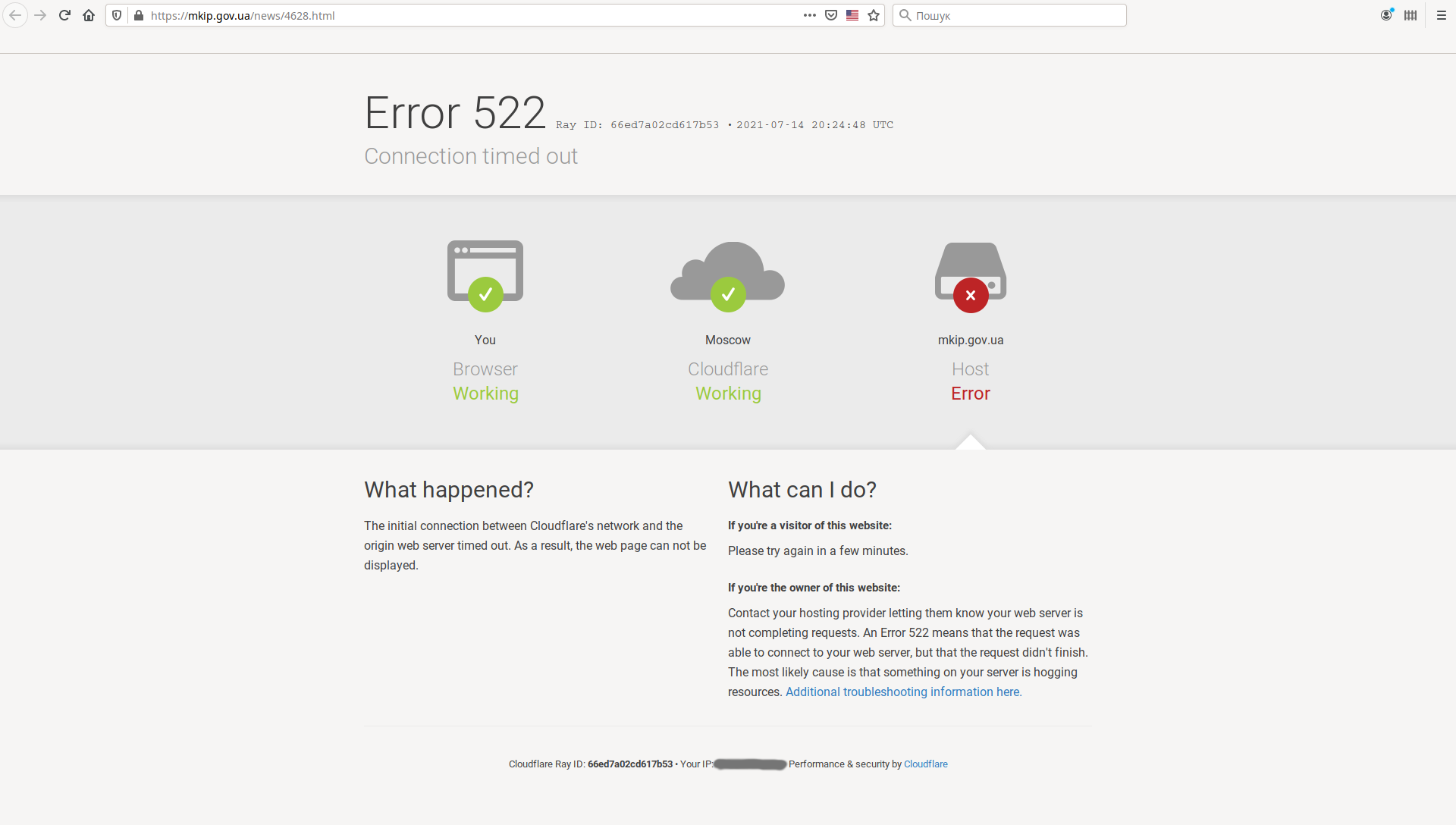 Попередній допис про фальсифікацію проекта Великого герба несподівано дозволив встановити ще один неприємний факт про нинішню „зелену“ владу. В ньому наведена ілюстрація, взята із сайту нинішнього Мінкульту (утвореного минулого року після погрому попереднього міністерства позаминулого року). Увечері 14 липня цього, 2021-го, року щось сталося чи то з сервером хостера, чи то із сервісом Cloudflare (одразу після цього були повідомлення про вразливість в одній із програмних служб Cloudflare), і сайт Мінкульту просто став недоступним. Замість будь-якої його сторінки можна було побачити ось таке повідомлення про помилку: